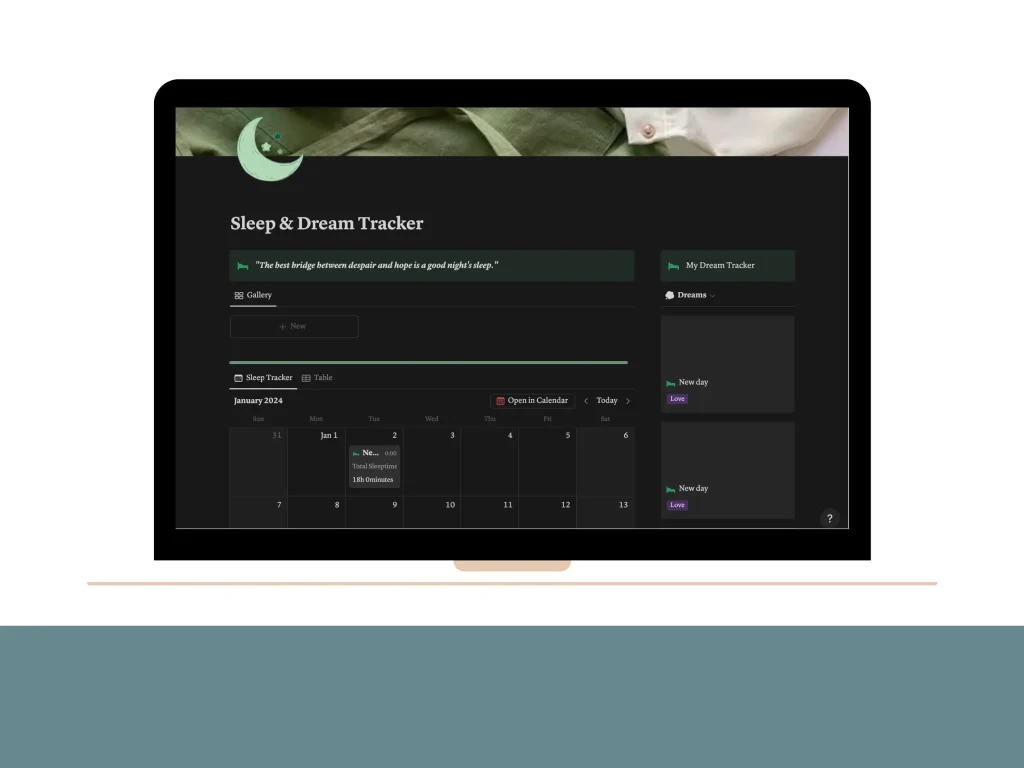 Track your sleep patterns and dreams effortlessly with this Notion template. Record sleep duration, quality, and dream details to uncover trends and improve your overall sleep health.